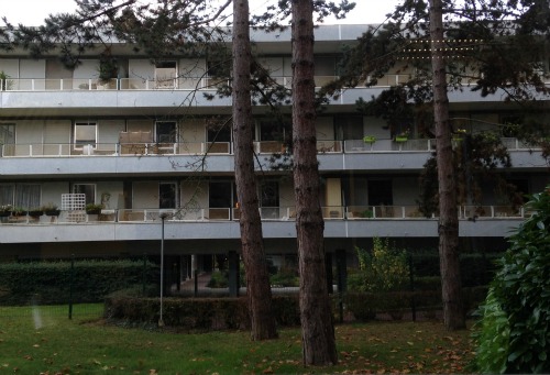 Je vois un immeuble, ou plutôt un des côtés d’une résidence en forme de cube, avec un jardin à l’intérieur.