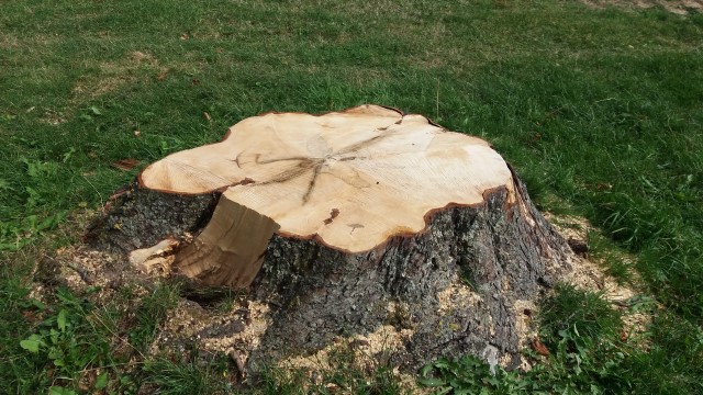 Quelques arbres ont été sciés, les souches sont encore toute fraiches comme celle-ci, il y a encore les traces de sciure. Le bois est très beau.