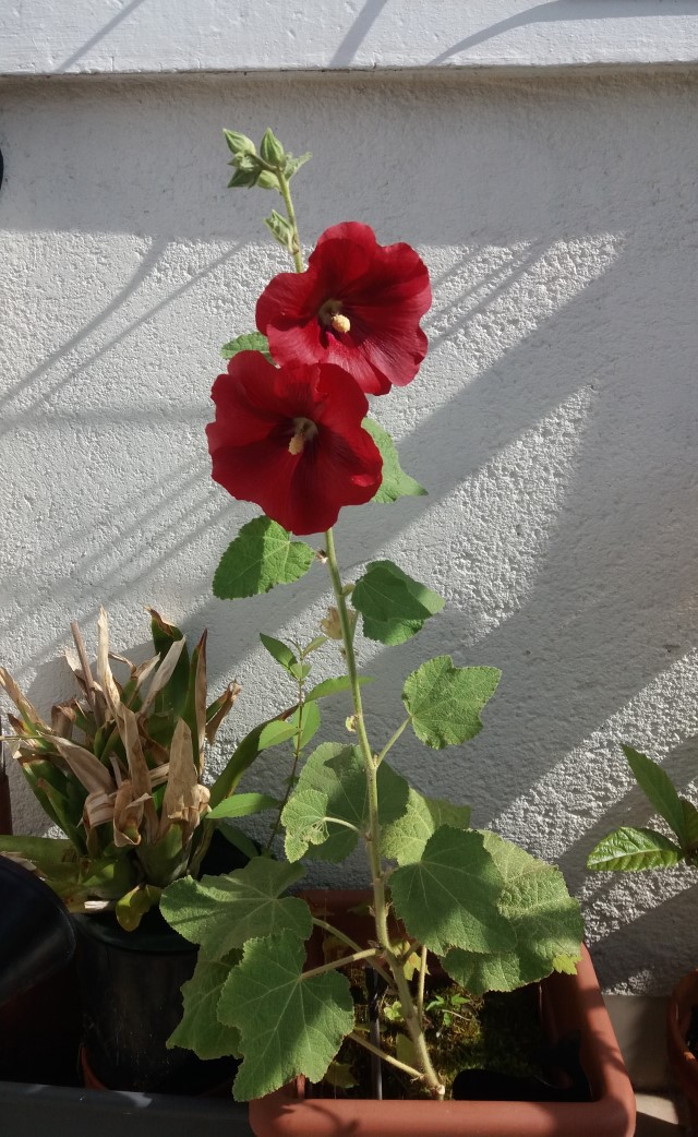 J’avais récupéré des graines de rose trémière il y a quelques années lors d’un séjour estival à La Couarde sur l’île de Ré. L’année suivante, j’ai planté quelques graines dans un pot sur mon balcon. Plus tard, quelques feuilles sont apparues et j’ai mis un moment à me rappeler la plantation et à reconnaitre les feuilles. Les saisons se sont succédé, les feuilles jaunissaient, tombaient, de nouvelles apparaissaient mais pas de fleurs. J’avais lu quelque part qu’il fallait attendre plusieurs années avant que la plante fleurisse. Je dois avouer que je n’y croyais plus !