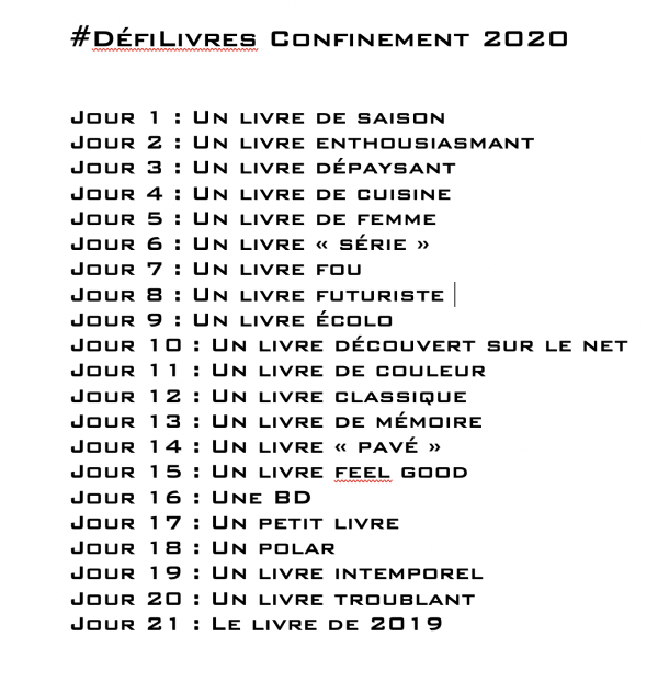 Pour animer cette période de confinement qui nous est imposée, MHF propose un nouveau Défi Livres analogue à celui de 2017. Quand il s’agit de livres, je suis toujours partante !